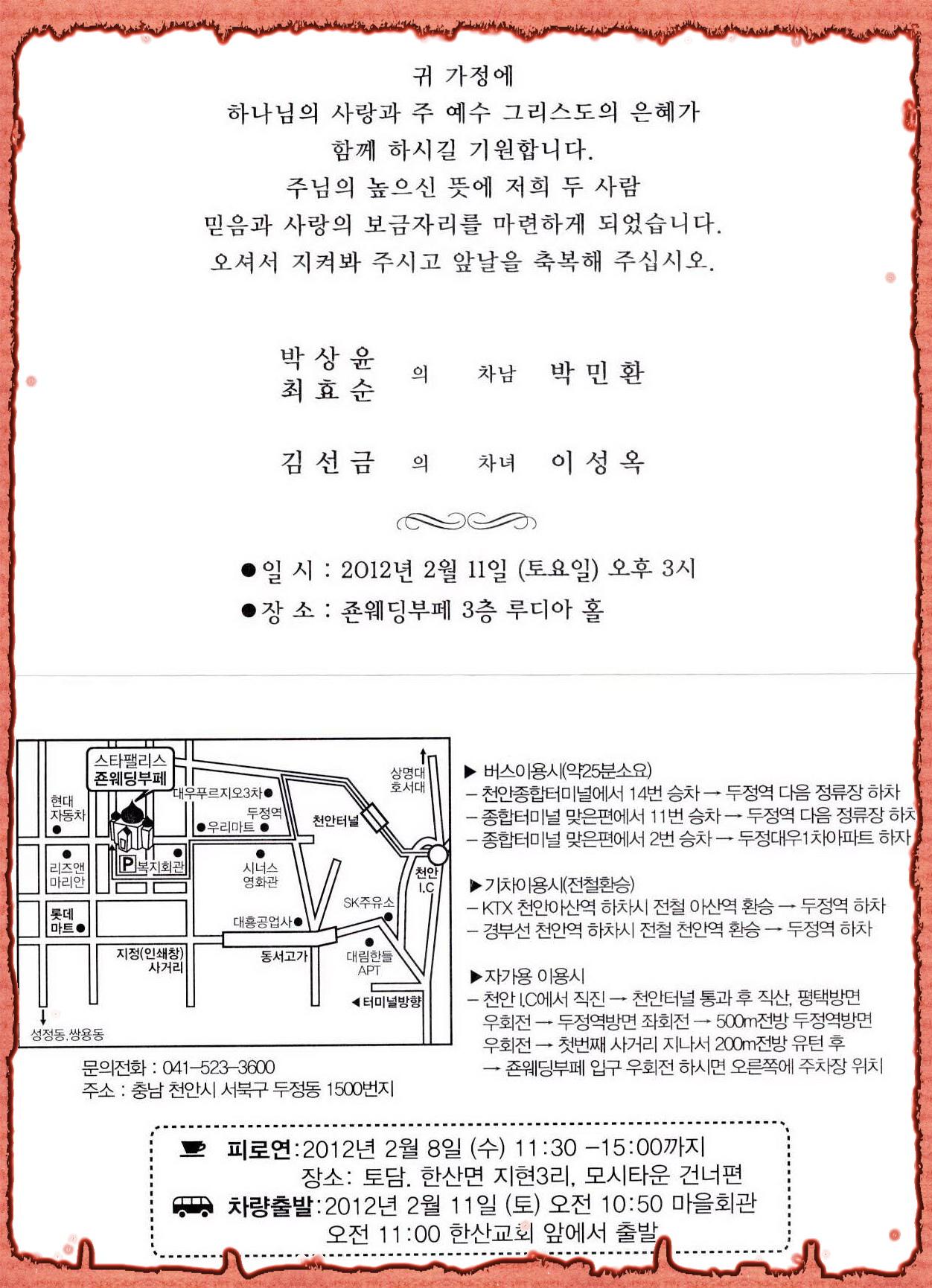 [결혼]박민환선생과 이성옥성도의 결혼예식이 2월 11일(토) 오후3시에 죤웨딩홀에 있습니다. 교우님들의 축복과 관심바랍니다.