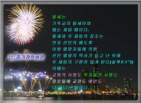 돈으로 사고판 목자들의 권위는 사회가, 국민이, 이 나라가 그들이 시험에 합격함으로 준 것인가? 이는 종교 교권자들이 돈으로 사고판 권력이 아닌가? 하나님이 주신 것도 아니고, 정부에서 준 것도 아니며, 자기들끼리 돈을 주고받으며 사고판 권력으로 누구를 압제하는 것인가? 이것이 말세를 재촉한 불법 행위가 아니면 무엇이란 말인가? 이 같은 곳에서 떠나 진리와 공의 공도가 있는 곳으로 나아온 것이(계 17:14, 18:4 참고) 죄가 되는 것인가? 입이 있으면 대중 앞에서 말해 보라. 참으로 반국가·반민족·반사회적 행위자가 누구인지, 그 행동과 그 열매로 그들을 알게 될 것이다(마 7:15-20, 눅 6:43-44). 이들이 수십 가지 죄목을 신천지에 뒤집어씌워 MBC PD수첩을 통해 50분씩 두 차례에 걸쳐 사회에 공포하였다. 이 소식을 들은 각계각층에서는 신천지(대표)에 대해 조사를 시작하였다. 이 잡듯이 말이다. 그 행태(行態)는 차마 사람으로서 얼굴을 들고 다닐 수 없을 정도로 심했다. 이 같은 수모(受侮)는 차라리 십자가에 매달리는 것보다 더 괴로웠다. 사회에서 매장하려고, 부모와 일가친척, 친구들, 학교 동문들, 직장 직원들까지 찾아다니며 샅샅이 조사를 했으니, 그 수모와 고통을 어이 말로 다하랴? 우리는 도마 위에 올려놓은 고기같이 죽은 몸이었다. 수많은 권력자들이 집결된 한기총의 핍박 세력의 쇄도와 압제 앞에 억울함은 눈물이 되어 하염없이 말없이 흘러 가슴 깊이 젖어들었다. 하늘을 우러러 한숨짓는 마음만 높아 갔고, 하나님은 불러도 불러도 답이 없는 것 같았다. 주님의 피를 주고 산 처음 익은 열매들은(계 5:9-10, 14:1-5) 모습마다 얼마나 낙심이 될 것인가? 이 불법에게 이기게 해 달라고 가슴을 찢으면서 주님의 십자가를 바라보고, 베드로와 바울의 형장을 바라본다. 이것이 그들이 간 길인가? 세상이 야속하기만 했다. 세상에서 인정받지 못하는 인생이라면 차라리 영이 되어 주님 따라가고 싶은 마음이 천번 만번 솟구쳐 올랐다. 나의 신앙의 첫걸음은 누구보다도 확실하였다. 기도하는 나를 천공(天空)의 별이 와서 인도하여 천신(天神)을 만나게 하였고, 혈서로 하나님께 맹세하고 시작한 신앙이다. 2차로 구름 속에 오시는 주님을 만나 인도받고 역사해 온 신천지가 지금 온갖 더러운 오물 물에 세례를 받고 있지 않는가? 천번 만번 가슴을 치고 또 치고 외쳐 본다. 하나님께서 주신 계시를 내 정성 다 바쳐 최선의 노력으로 전한 것이 죄로 돌아왔단 말인가? 하늘도 보고 땅도 이를 보았다. 공의 공도가 물거품이란 말인가? 내 증거가 진리라면 이겨야 한다고 결심 결심할 때 이제야 힘이 솟는다. 찬미가 입에서 나온다. 계시 말씀이 연속 힘 있게 터져 나온다. 샘물이 터져 솟구쳐 나오듯 생기가 솟아오른다. 이 한 목숨 하늘에 걸었고, 천검(天劍)을 높이 들었다. 싸우자, 승리하자. 하늘이여 도우소서. 천군(天軍)들의 말굽 소리 천지진동한다. 귀에 쟁쟁하다. 계시 증거 설교 소리는 번쩍이는 천검같이 날아 나간다. 이 때부터 힘이 솟아올랐다. 마치 천마(天馬)를 타고 달리는 것 같다. 다행히도 우리 성도들은 MBC PD수첩 보도는 거짓인 것을 잘 알기에, 그 일로 단 한 사람도 탈락된 성도는 없었다. 이것이 진리로 승리하는 것임이 확실했다. PD수첩을 보고들은 각계각층의 조사 결과는 어떻게 되었는가? 문광부도 경찰도 검찰도 세밀한 검사 결과 후 신천지에 대하여 ‘혐의 없음’으로 판정하였고, 그 보도가 거짓이었음을 각 언론에서도 보도하였으며, 기자 회견을 통해서도 밝혀졌다. 이후 MBC PD수첩에서는 급기야 정정 보도 및 반론 보도를 하게 되었다. 사실이 이러하다면 허위 보도한 자들을 처벌하여 명예 훼손이 된 사람들의 마음을 위로해야 할 것이다. 허위 보도한 자들을 처벌하지 않음으로 또다시 그 같은 거짓 행동이 유발될 수 있을 것이다. 진리와 정의는 누구를 믿어야 하며, 누구에게 호소해야 하는가? 반국가·반민족·반사회자는 누구이며 어떤 자인가에 대한 답을 내어 본다. 반국가·반민족은 자기 나라를 반대하는 처사라 할 것이다. 그 예를 들면, 나라를 사랑하고 나라를 위해 일하는 자들을 반대하는 것이며, 이들은 매국노(賣國奴)들이라고 생각된다. 신천지인도 엄연히 주민 등록을 한 시민이요 국민이며, 이 나라의 교육을 받았고, 군 복무로 나라에 충성하였으며, 국가에 세금을 내고 있다. 현충일 및 광복행사에 참여 또는 주관하여, 국기를 사랑하는 마음으로 대형 손도장 태극기를 만들어 애국심을 고취하며, 사회에 자원 봉사를 하는 것이 반국가·반민족인가? 조국 통일을 염원하는 비석을 세운 것이 반국가·반민족인가? 그대들은 나라를 위해 무엇을 했는가? 그대들은 오히려 조국 통일을 방해하는 행위를 했다. 조국통일선언문 기념비를 철거했으며, 현충일과 광복 행사를 못 하게 방해했다. 또 자원 봉사를 못 하게 방해했다. 이것이 반국가·반민족이다. 또 국립현충원에 비치한 대형 태극기를 철거하게 하였고, 만들지 못하게 했다. 이것이 반국가·반민족·반사회가 아니면 무엇인가? 우리는 자원 봉사를 통한 헌혈증을 기증하였고, 나라의 재해(災害) 때 자원 봉사로 도왔고, 
