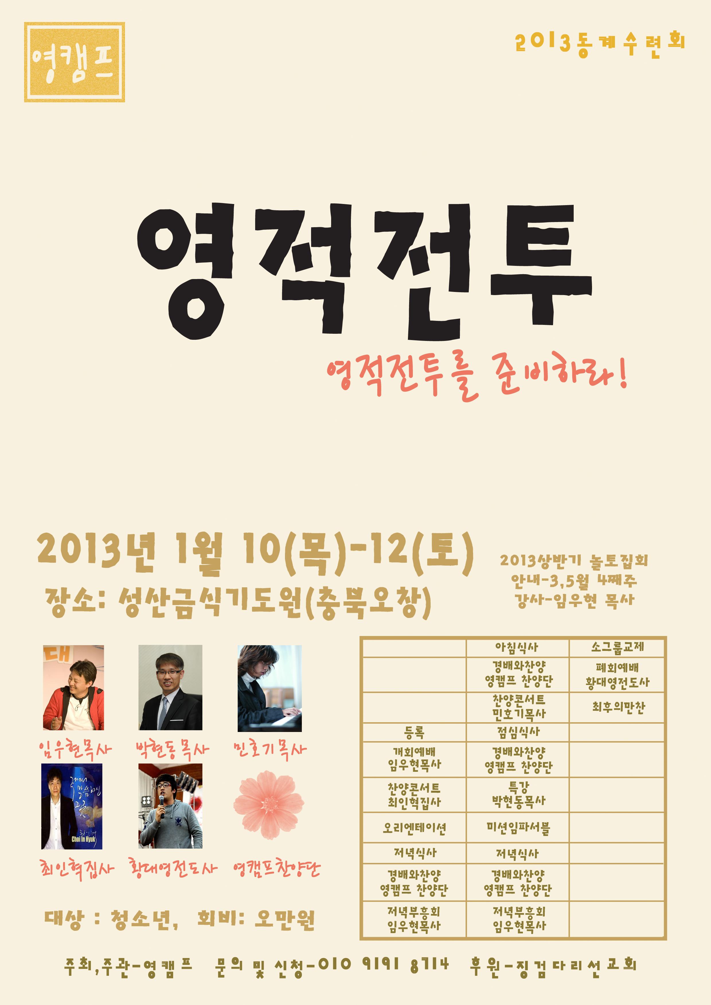 안녕하세요! 영캠프입니다. 2013년 청소년 겨울캠프가 다음과 같이 진행됩니다. 참고 하시고 많은 참여 부탁드립니다^^ 영캠프 겨울 캠프 * 주 제 : 영적전투를 준비하라! * 기 간 : 2013. 1. 10(목)~1.12(토) 2박 3일 * 장 소 : 성산금식기도원 -주소 : 충북 청원군 오창읍 성산리 636-4 -전화 : 043)217-9420 * 대 상 : 청소년 * 참가비 : 1인당 50,000원 * 강 사 : 임우현 목사, 박현동 목사, 민호기 목사, 최인혁 집사, 황대영 전도사, 영캠프 찬양단 * 문 의 : 황대영 전도사(010-9191-8714) (http://club.cyworld.com/ClubV1/Home.cy/52715616) |
