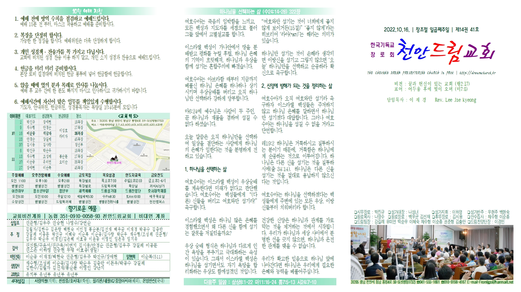 샬롬! 샬롬! 복된 주말, 축복된 주일 되시기를 기원합니다. https://youtu.be/S0y4qiRcXhk 주일예배 | 주일오전 11시 | 벧엘성전 http://chdeam.onmam.com/bbs/bbsView/40/6157335 교회학교 주일예배 Link | 주일오전9:30 | 벧엘성전 유년부 예배 : 주일오전9:30 https://youtu.be/EBnw0Bzn1BE 벧엘성전 유치부 공과 : 주일오전9:30 https://youtu.be/T3i3bxm_950 소망홀 청소년부QT : 주일오전10:00 https://youtu.be/Kg9G5ZccnbM 별관2층 북까페 천안드림교회 http://dreamchurch.kr